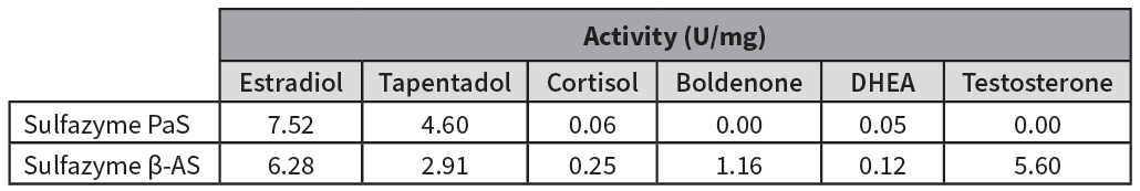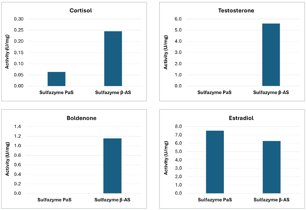 Sulfazyme™ β-AS (EC 3.1.6.1) is a purified recombinant variant of arylsulfatase derived from Sulfazyme™ PaS, specifically designed to hydrolyze boldenone sulfate and testosterone sulfate.